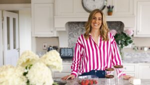 Mags Roches én skål vaniljekage med fersken og hindbær