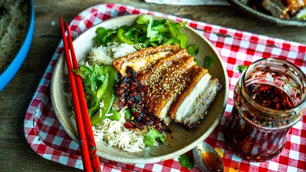 Donals flæskesvær, en pande ris og grøn peber slaw